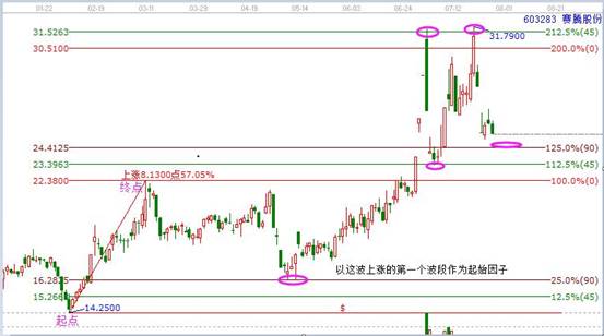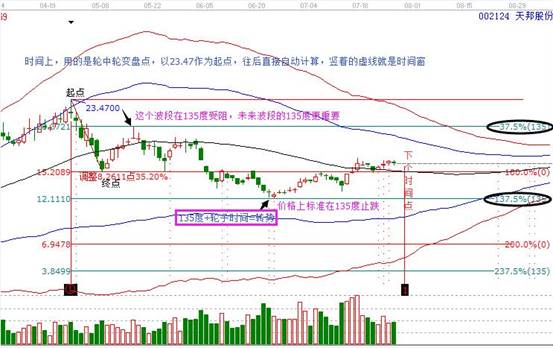 以5月20日的低點和6月20日的高點為起始點,選擇這波上漲空間為波動因子,同時結合市場走勢保留了江恩45度分割比率,圖形如下: