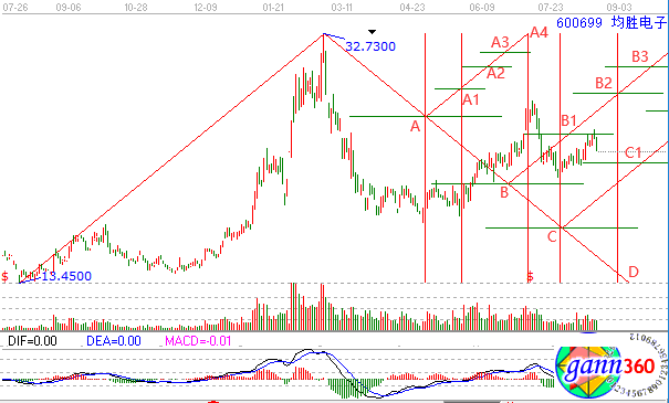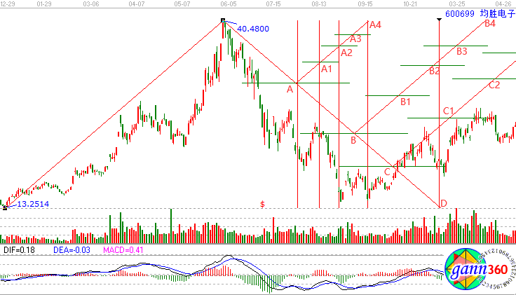我們以2014年12月30日作為起點,2015年6月2日作為終點來進行作圖,圖中線段ABCD是主要趨勢線,所有字母標注的點位是可能發生趨勢轉折的點位,而這些點位所對應的時間也是重要的時間變盤窗口。上圖中A點是一波急跌的終點;A1是一波上的終點同時也是一波下跌的起點;A2是一波下跌的終點;A4是一波上漲的開始;D點是一波下跌的終點。