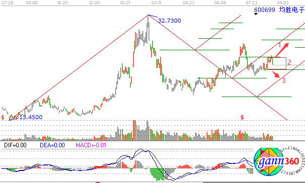 至于對股市中趨勢的轉折如何分析,我們可以借助贏家江恩軟件中的轉折趨勢線來進行。下面我們就用這個工具并以600699均勝電子為例來進行分析展示。(圖中的紅色斜線為趨勢線,綠色橫線為支撐、壓力線,紅色豎線是為了方便展示轉折點所對應的K線位置)