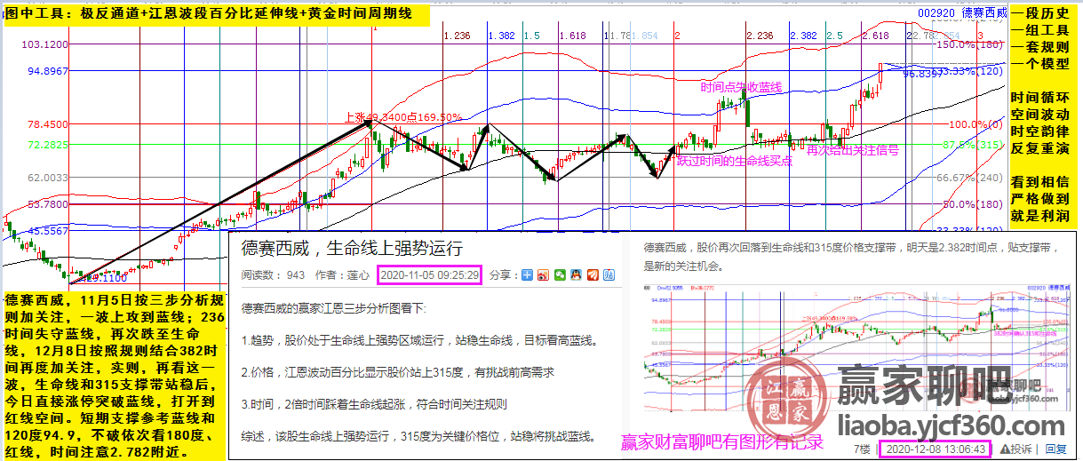 德賽西威,11月5日按三步分析規(guī)則加關(guān)注,一波上攻到藍(lán)線;236時(shí)間失守藍(lán)線,再次跌至生命線,12月8日按照規(guī)則結(jié)合382時(shí)間再度加關(guān)注,實(shí)則,再看這一波,生命線和315支撐帶站穩(wěn)后,今日直接漲停突破藍(lán)線,打開(kāi)到紅線空間。短期支撐參考藍(lán)線和120度94.9,不破依次看180度、紅線,時(shí)間注意2.782附近。