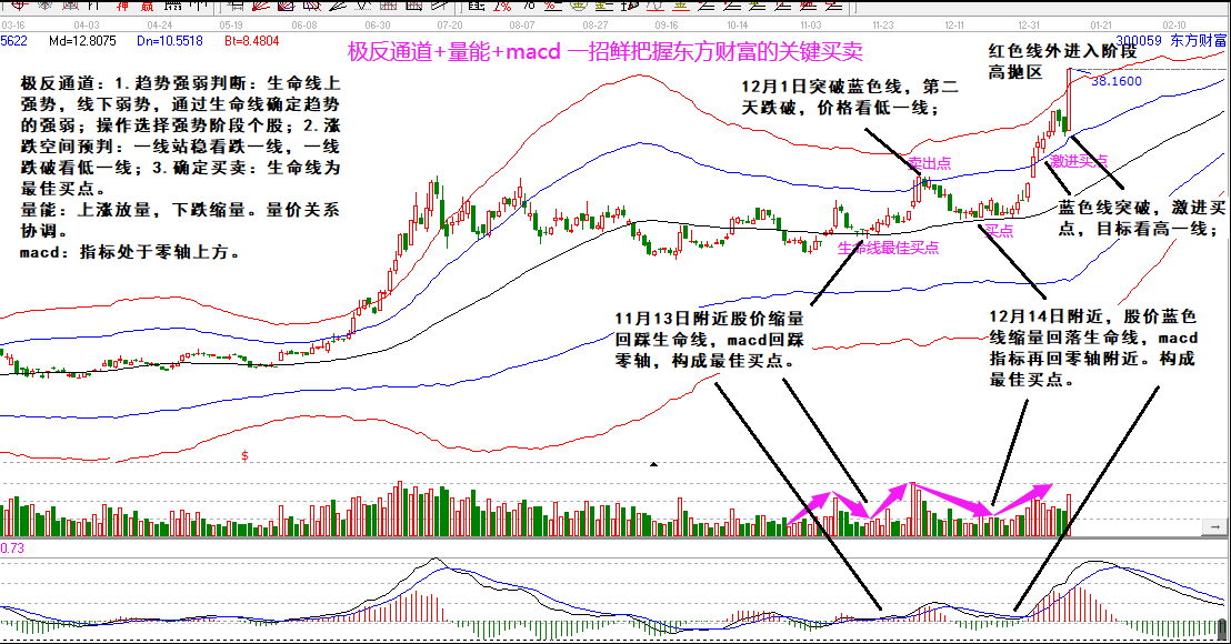 極反通道+量能+macd,一招鮮把握東方財(cái)富的關(guān)鍵買(mǎi)賣(mài)。