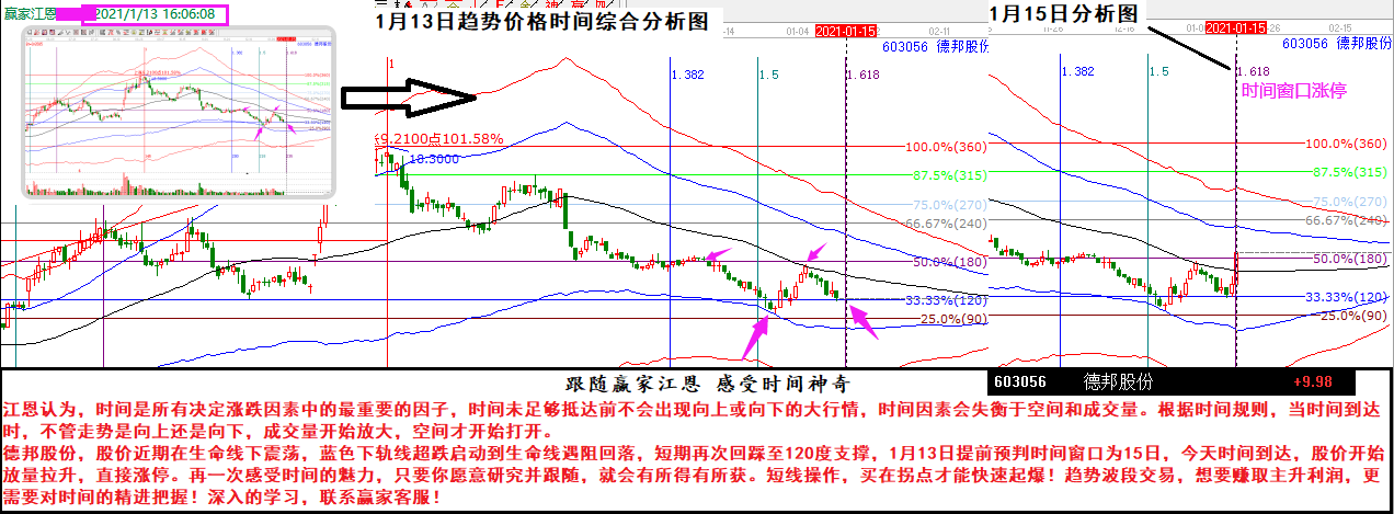 德邦股份,股價(jià)近期在生命線下震蕩,藍(lán)色下軌線超跌啟動(dòng)到生命線遇阻回落,短期再次回踩至120度支撐,1月13日提前預(yù)判時(shí)間窗口為15日,今天時(shí)間到達(dá),股價(jià)開(kāi)始放量拉升,直接漲停。再一次感受時(shí)間的魅力,只要你愿意研究并跟隨,就會(huì)有所得有所獲。短線操作,買(mǎi)在拐點(diǎn)才能快速起爆!趨勢(shì)波段交易,想要賺取主升利潤(rùn),更需要對(duì)時(shí)間的精進(jìn)把握!深入的學(xué)習(xí),聯(lián)系贏家客服!