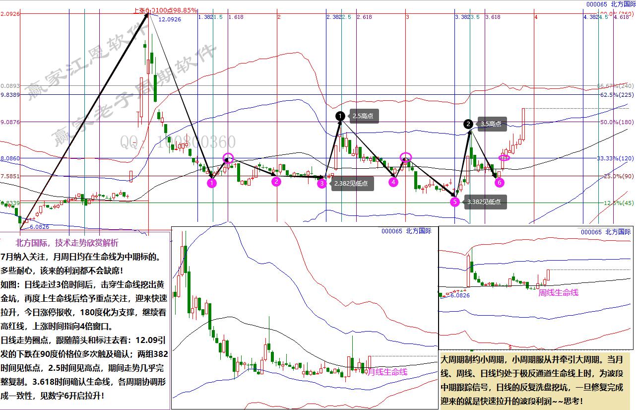 如圖:日線走過3倍時間后,擊穿生命線挖出黃金坑,再度上生命線后給予重點關注,迎來快速拉升,今日漲停報收,180度化為支撐,繼續看高紅線,上漲時間指向4倍窗口。