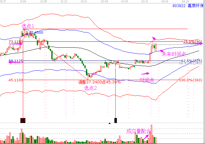 在我們深入了解上面的圖形前,我們來簡單了解一下什么時間跟的時價共振。時間和價格的關系是江恩理論研究的一對經典關系。時價共振是指當價格到達重要重要的位置(壓力或者支撐),時間窗口到來,確定我們買入或者賣出的操作。下面我們來看上圖中嘉澳環保603822的走勢。買入的時候股價遇到了江恩波段百分比225度位置支撐,下面的虛線是時間工具江恩輪中輪變盤點,整好是買入的那天為時間變盤點,這都成就了這個買入的操作,當然也收獲了到利潤。下面我們來看嘉澳環保的完整圖形。