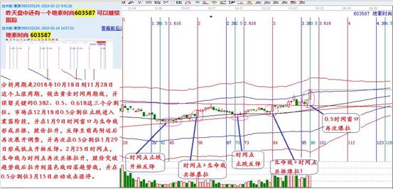 分析工具是江恩黃金時間周期線與極反通道,輔助趨勢線做圖。筆者選取的分析周期是2018年10月18日到11月28日這個上漲周期,做出黃金時間周期線,并保留關鍵的0.382、0.5、0.618這三個分割位。市場在12月18日0.5分割位止跌進入震蕩階段,并在1月9日時間窗口與生命線形成共振,股價拉升,反彈至前高附近后再次展開調整,并再次在0.5分割位1月29日形成低點開始反彈。2月25日時間點,生命線與時間點再次共振拉升,股價突破趨勢線后拉升到藍色線回落趨勢線,并在0.5分割位3月15日啟動攻擊漲停。