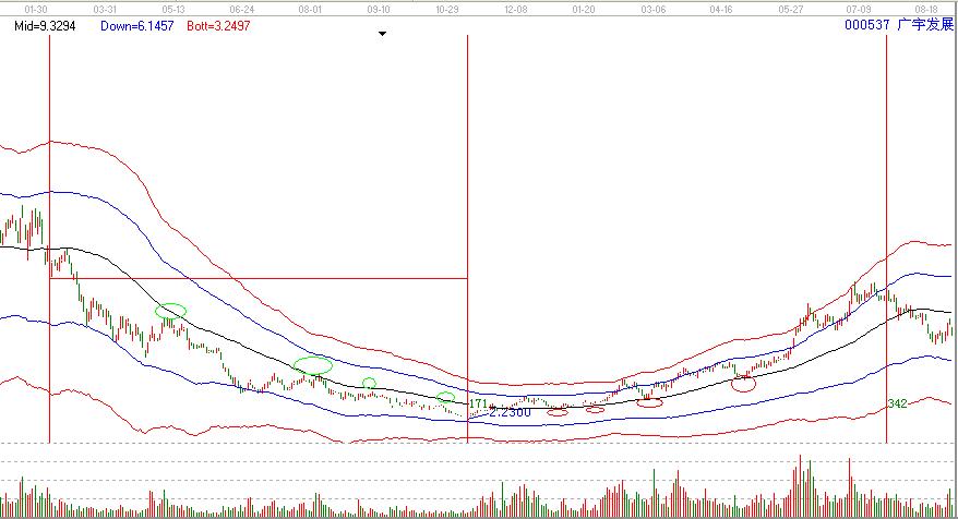 000537在2008年3月份11快附近破極反通道生命線開始下跌,在下跌的過程當中,都是碰到極反通道就下的,直到2008.11.月份見底后上攻建發集團的生命線,短期的橫盤后展開了一波小牛行情,在上升的過程當中,每一次極反通道生命線的回踩都是你所介入的位置,極反通道買賣交易規則,這樣你就不會被黑馬拋棄了。直到上攻到2009.7月份11.00附近,中間有誤差【低點到高點剛好運行了一個循環】