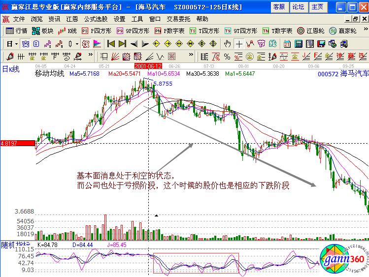 下面我們通過具體的實例進行分析,海馬汽車是一只長期處于弱勢運行的股票,其基本面的消息是,公司地處海南,主營業務是開發區的綜合開發,建設以及管理,而該公司在2001年的是處于虧損的狀態,相應的股價也處于連續的下跌中,其中虧損的原因是依據國家的改革進行各項資金回歸實際價值,化解資產虛增的潛在因素。