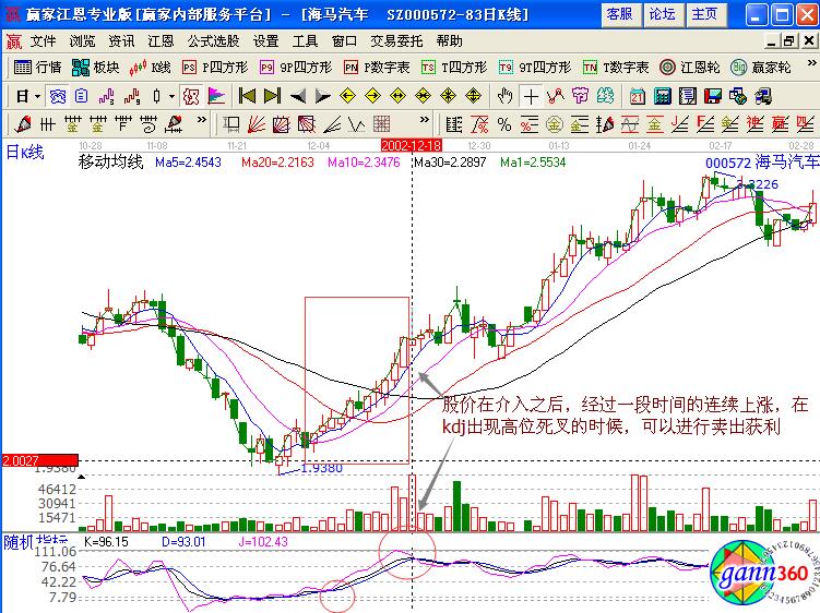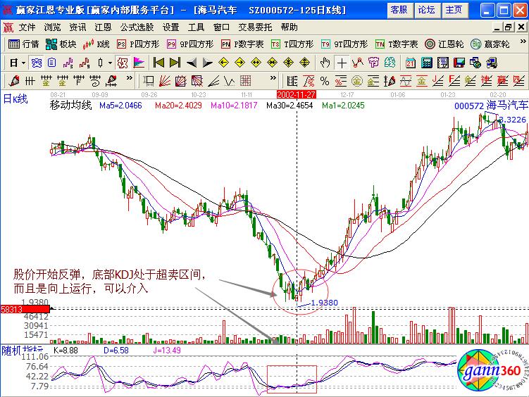 從中可以觀察到該股下跌的趨勢一直延續到2002年11月27日,而且當天的最低價是在4.20元的位置,股價在當天出現了小陽線的走勢,在12月5日的時候,對應的KDJ指標日線走勢觸及頂部并且有鈍化的跡象出現,所以股價出現了上下震蕩的走勢,而且當天股價的最高價與最低價相差有4.82-4.63=0.19元,這個時候很多的短線投資者都會拋出離場。