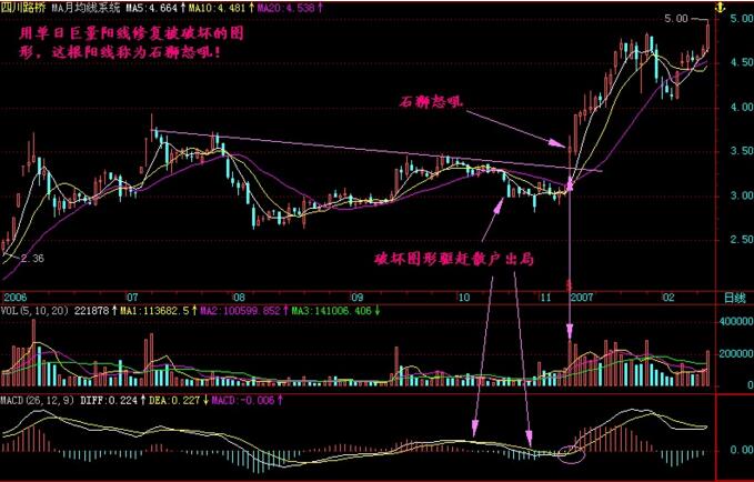 該股在2006年12月到2007年初的股價走勢,前期經過一段時間的下跌行情,也就是主力進行洗盤操作的過程中,將散戶驅趕出局,破壞了下跌的圖形,之后股價經過拉升,使用一根單日巨量陽線修復被破壞的圖形走勢,形成“石獅怒吼”的操作形態,而對應的成交量是巨量的形態,macd指標中的走勢是金叉買入的操作形態,這個時候股價處于均線的上方運行,均線的走勢是進行買入的信號,所以投資者綜合幾個方面的因素進行分析,是可以進行買入操作等待后市上漲的。