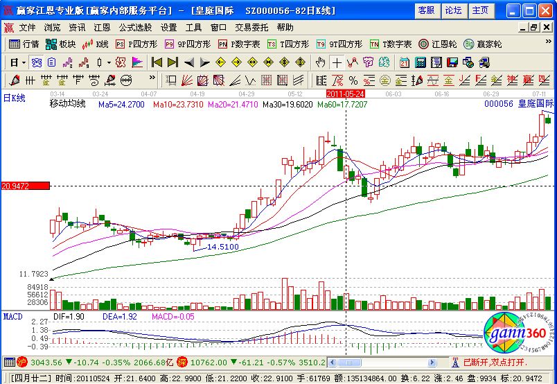 首先,皇庭國際在2011年5月份之前,已經經過了一輪的上漲,前面一輪均線上呈現的是多頭排列,我們圖中可以看到該股在5月19日的時候,雖然收類似的十字星形態,但是相對前一天來說仍然是一個假陰,股在接下來的兩天該股連續兩天收陰線,所以筆者在連續下跌的三天之后,在5月24日的時候以21.68元的價位買入,在次日以22.7元的價位進行賣出,獲利4.7%!