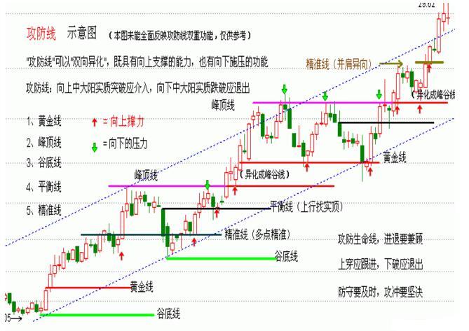 是所有量線的代名詞,但不包含峰谷線,攻防線可攻可守,股價在其上方,下踩線不破可以介入;中大陽線實質(zhì)下破要接機(jī)退出;股價在其下方,上觸線不過要退出,中大陽實質(zhì)上穿要積極介入;