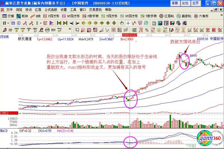 同時對比在極反通道中的走勢形態,股價在3月2日的時候剛好處于生命線的上方,是強勢運行的信號,而且量能微微縮小,macd指標形成金叉走勢,之后的量能逐漸的放大,是一個穩健的買入點,之后股價向上突破了藍色上軌線,并突破紅色外軌線運行,在股價跌破紅色外軌線的時候,投資者要考慮賣出的操作。