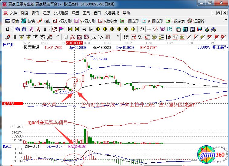 當然具體的個股走勢舉例如圖張江高科,在2016年8月份的股價走勢,8月15日上漲突破極反通道生命線上方,并形成大陽線,進入強勢區域運行,同時macd指標形成了金叉買入信號,量能逐漸放大,預示著上漲的行情走勢,是一個不錯的買入點位置,希望投資者能夠把握其中的操作機會。