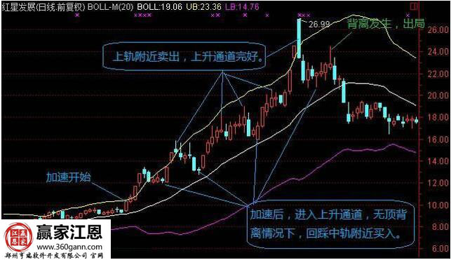 股價(jià)加速上漲,在尖頂回落中軌,一般是買(mǎi)入的機(jī)會(huì),其后至少有一次上攻,上攻力度比較強(qiáng),能夠再次攻擊上軌,構(gòu)成了上升通道,當(dāng)股價(jià)回落中軌的時(shí)候可以進(jìn)行再次買(mǎi)入,如果力度比較弱,構(gòu)成背離形態(tài),就需要及時(shí)的出局。具體的走勢(shì)形態(tài)如下紅星發(fā)展的K線走勢(shì)變化。