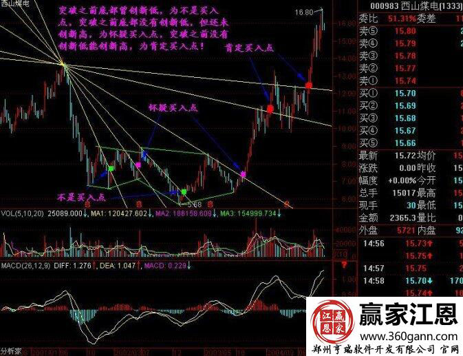 如果股價在突破扇骨線的時候,前面的底部沒有創出新低,但是前面的高點創出了新高,那么這個點位就是肯定買入點,因為從趨勢上進行分析,股價已經止跌,并創出了新高,上升趨勢已經形成,比較適合激進的投資者與穩健型投資者進行追漲操作。