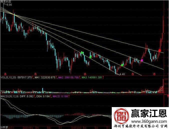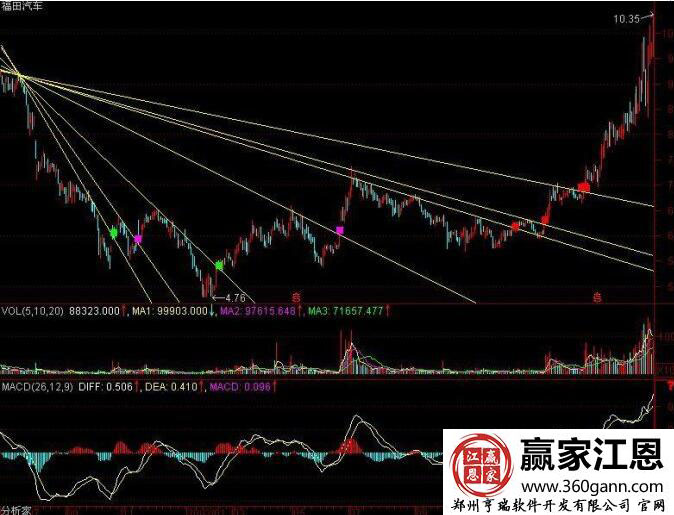 如圖該股的走勢形態形成了一個階段性的最高點,而且在之后的突破點中,都沒有突破新高,從其畫圖的走勢中,能夠看出,扇骨線具有三個基本特征:伺從性,指的是K線會依據扇骨的走勢進行運行;支撐向,股價一旦沖過扇骨線以后,再回落的話,一般壓不到前面的扇骨線;突破性,只有突破才有行情,沖不過去就沒有行情;