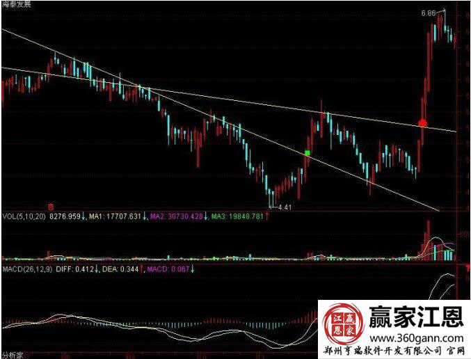 如圖海泰發展中的紅色點標注位置,就是其中的肯定買入點;