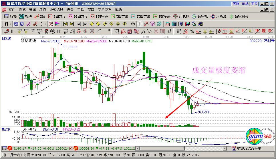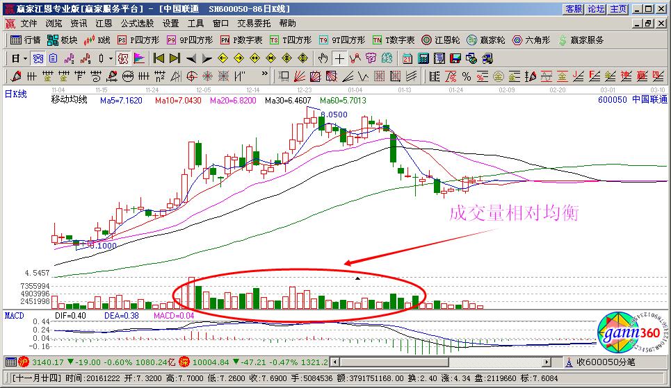 第一,成交量是技術分析中的核心標準,分析成交量是出發(fā)點,它有相對成交量和絕對成交量兩種概念,其中絕對成交量在一般情況下意義不大,只在新股上市第一天是重要參考指標,其后相對成交量是主要參考指標。而相對成交量又分為相對均衡、極度放量、極度縮量三種情況。在日k線圖中,成交量變化反映了莊家操作過程,若散戶精力有限,就可以透過極度放量來判斷莊家行為。若發(fā)現成交量突然放大,就可以判斷出莊家在此有所動作。