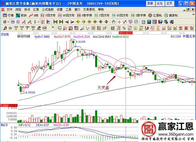 具體的實戰案例如圖中國北車(601299)在2011年3月初的股價走勢,從6.5元的價格上漲到9.61元的價格,經過一段時間的上漲周期,均線拐頭向下運行,出現天靈蓋形態,預示著下跌賣出的信號,但股價跌破平臺的60日線,必須要及時的賣出獲利。而且股價向上沖擊60日線未果,量能也沒有出現有效的放大,60日均線下方的小平臺是賣出的時機,當股價再次破位就是下跌的行情;