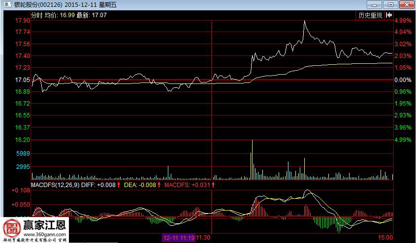 在跳空低開以后的第二天,12.10全天橫盤針對那個收陰線,估計這個時候有大部分的分析者會認(rèn)為是進(jìn)入到了陰跌通道了,所以離場情緒是非常濃厚的,而這之后的走勢就會更加的有趣了。下面是2015年12月11日的分時走勢圖。