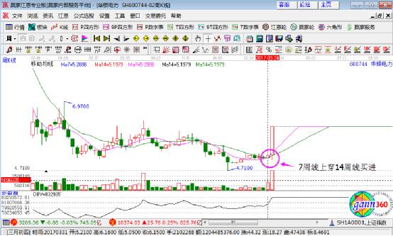 1、 均線運行:K線圖上,當7周均線上穿14周均線時,堅決買進(如下圖);反之,當7周均線下穿14周均線時,就果斷賣出。
