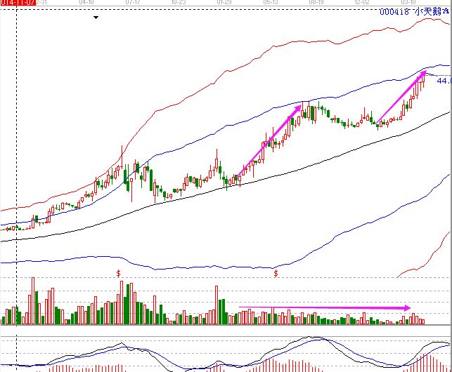 上漲無量是股票比較強勢的走勢,到極致就是無量漲停。無量上漲是成交量少,沒有此票的人很那買到。而有這票的人就只需等待上漲即可,這些股票一般出現在莊家對于股票高控的時候,少量的成交量就能夠帶來股價的上漲,最近的小天鵝A的走勢就是如此,我們從周線上可以明顯的看出來。