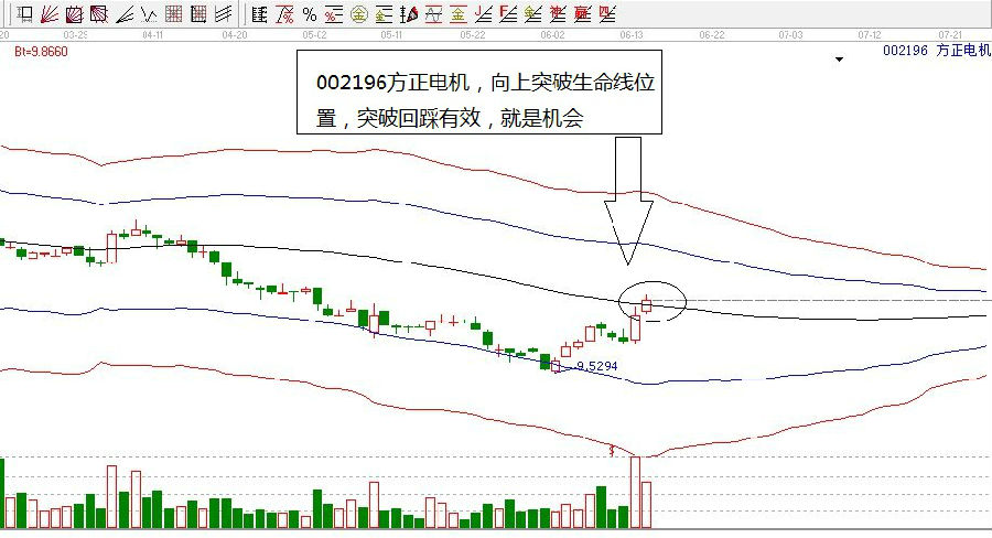 特色的極反通道,能夠我們幫助看清支撐阻力,而且在使用方面也是相對比較簡單的,如下圖中的方正電機走勢圖,股價正要向上突破生命線位置,突破回踩有效,就是機會,而且使用這款軟件可以享受一對一的投資建議服務。