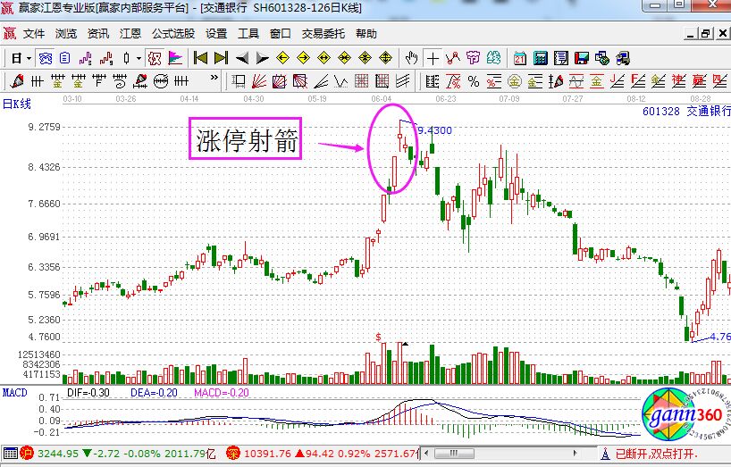 漲停射箭是什么?它指的就是高位漲停之后,莊家進行出貨手法。具體的介紹就是,股價在經過一段時間的上升,創出階段新高,拉出漲停板之后,第二天的走勢是沖高回落,而且連帶著收出的是帶長上影線的小陽線或者是小陰線,同時成交量是大幅的放大,如下面的交通銀行走勢圖。