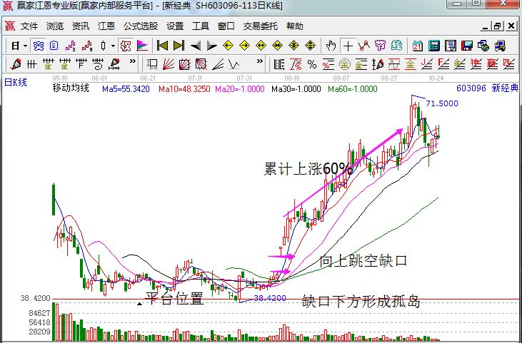 上面是新經典的近期日K線走勢圖,技術形態上,股票在前期下跌形成了一個底部區間平臺,而這個平臺的整理周期近3個月,而股票在今年的8月14日的那一天高開形成向上的跳空缺口,缺口幅度達到了8%,缺口下方就形成的孤島特征,所以符合底部孤島模型,