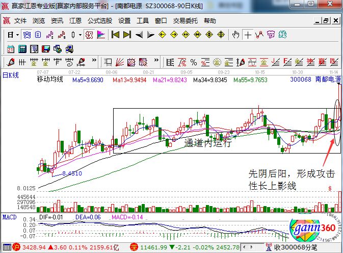 股票波段式上升趨勢,其中一段時間內(nèi)在盤整通道內(nèi)運(yùn)行;其中一日股票的前一個交易日出現(xiàn)縮量陰柱,第二天放量收復(fù)綠柱,收盤時收紅,同時并留下長長的上影線,上影線的最高點(diǎn)正好觸及盤整通道的上沿,此時,盤整通道內(nèi)攻擊性上影線買入法就已經(jīng)具備了,在長上影線的下一個交易日,將進(jìn)行關(guān)注。