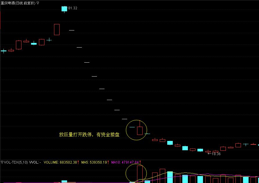對(duì)于一字跌停板來(lái)說(shuō),全天成交量越小,換手率月底,就說(shuō)明了空方的拋壓越多,多方的承接盤(pán)也就越少了,所以相應(yīng)的后續(xù)下跌的力量就會(huì)更強(qiáng),跌幅更大。相反的,如果成交量越大,換手率就越高,那就說(shuō)明了多方承接盤(pán)開(kāi)始大量介入,相應(yīng)的股價(jià)就會(huì)立即止跌企穩(wěn)。如下面的重慶啤酒走勢(shì)圖。