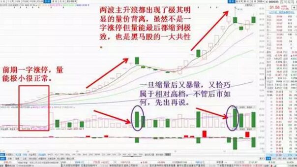 黑馬的一大特征就是籌碼極其穩定,主升段量能幾乎不會失控,即使不是一字漲停,量也不會很大,證明主力仍在堅決控盤,惜售情緒明顯,散戶莊家都對未來的走勢十分確定,此時恐慌情緒不易蔓延,形成了“賣方市場”。如下面的四川雙馬走勢圖。