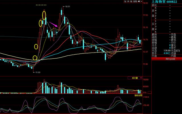打開股票軟件調出上海物貿在去年11月份的走勢,從圖中偶們可以看到股價前面先后是出現了4個漲停板基因的,在2017年11月13日時當天股價呈現了高開異動上漲,同時對比前一天成交量的話,當天呈現明顯的放大,如圖中粉紅色箭頭所指的那根K線。在走勢中沒有下探回補當天跳空高開的缺口,在第二天股價就呈現出了漲停。
