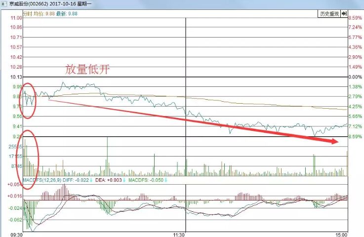 在2017年10月13日出現了低開低走的分時走勢,此時就要開始特別謹慎,如下圖。