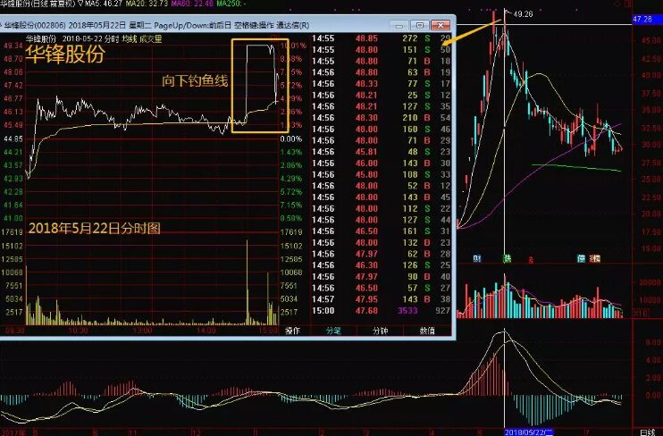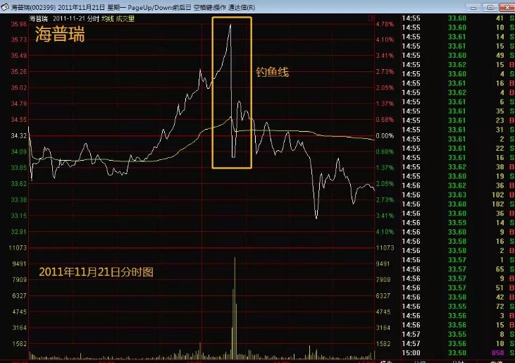 釣魚(yú)線形態(tài)是怎么來(lái)的?在個(gè)股當(dāng)日即時(shí)走勢(shì)中,主力迅速拉高股價(jià),開(kāi)始基本保持某一斜率地上行,漲幅超過(guò)7%,之后突然直線大幅跳水,主力大單拋貨將下方追漲的買盤(pán)一網(wǎng)打盡,形成類似一根“魚(yú)桿”及垂釣的“魚(yú)線”的圖形,這其實(shí)就是釣魚(yú)線名稱的由來(lái),如下圖所示。