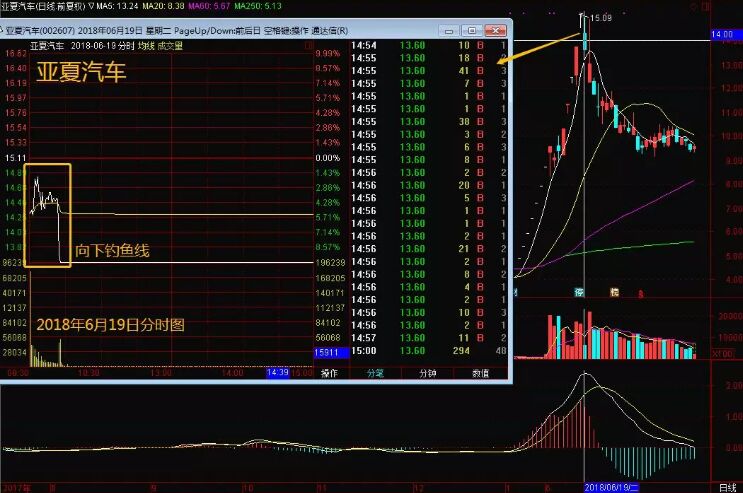 向下釣魚(yú)線,它指的就是因?yàn)檫B續(xù)上漲,股價(jià)已到達(dá)莊家目標(biāo)位置而且莊家已經(jīng)獲利豐厚,同時(shí)由于連續(xù)上漲,市場(chǎng)人氣相當(dāng)亢奮,積聚了大量的跟風(fēng)盤(pán),而且莊家認(rèn)為大盤(pán)行情即將結(jié)束,來(lái)不及做高位區(qū)間出貨,此時(shí)莊家樂(lè)意選擇該種手法出貨,如下面的亞夏汽車走勢(shì)圖。
