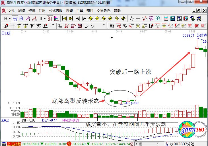 上圖是英維克歷史上的部分走勢圖,從圖中可以看到,股票下跌趨勢已經接近末端,股價一個向下跳空,開始了底部盤整,形成了底部反轉形態,盤整幾天內成交量芝麻大點,并沒有比較大的波動,在盤整幾日之后,股價向上高開突破,同時成交量驟然放大,底部島型反轉形態徹底形成后,股價開始持續上行,短期漲勢就會非常驚人。