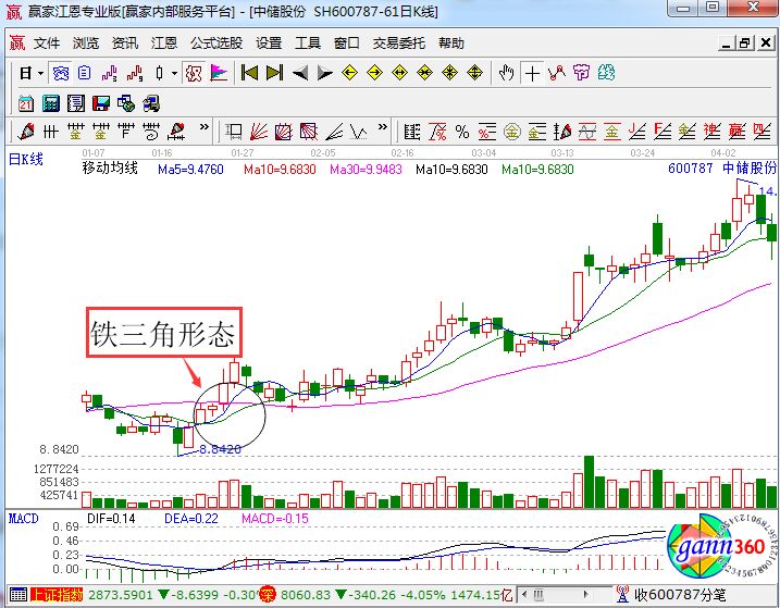 均線鐵三角形態是什么?它其實指的就是5日均線由下向上先后金叉10日均線、30日均線,10日均線再金叉30日均線,這三條均線圍成一個三角形態。如下面的中儲股份走勢圖。