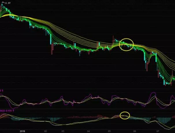 其后,K線果然開始止跌盤整,后市開始慢慢回升顧比均線快線組開始上穿慢線組,其中3、5、8線突破慢線組,但是不就就出現跌破慢線組,多頭很快的湮滅,顯示反彈那失敗。