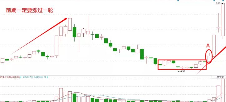 上圖是日出東方的部分截圖,從圖中我們可以看到該股出現了一輪上漲式的行情,并且漲幅在20個點左右,當大陽線出來后,指數再次拉升之后肯定會有很多跟風盤,我們看到主力再創出近期新高之后以非常快速的方式大幅跳空低開,隨后就開始一系列宰殺行為,不斷的有跳空小陰線形成明顯的挖坑行情,隨著一連串小碎陽的出現走出了一個箱體運行,同時下方的量能是出現了近期的地量行情,隨著A點的有效突破箱體上沿,同時下方出現了小倍陽的量能增加走勢,因此這個突破點A就是我們進場的好時機,可以享受到后期拉漲的快感。