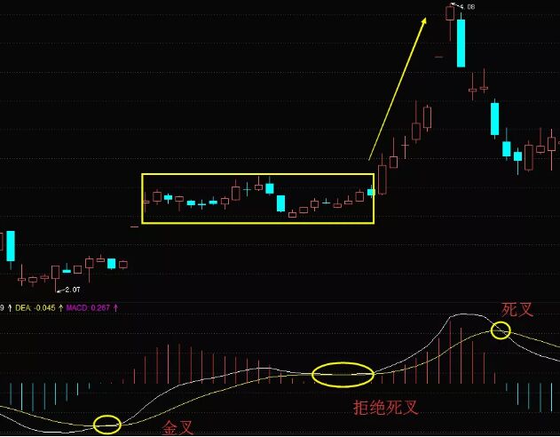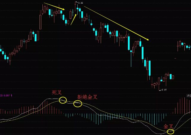 如上圖所示,股價經過了一段時間的上漲,已經是處于相對的高位了,股價已經是無力上漲了,所以開始下跌,macd白線下穿黃線形成死叉,此后股價很快進行反彈再次沖擊前高,macd欲形成金叉,但白線剛觸及黃線,股價即無力下跌,金叉尚未形成,白線再度下跌,由此形成“拒絕金叉”,此后股價與MACD雙線均一路向下,走出下降趨勢。