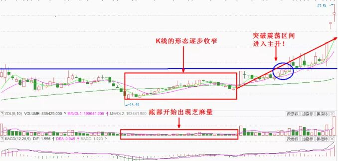 芝麻量是什么?它其實指的就是:在莊家建倉完畢時,股價已經有升高,為了清洗浮動籌碼,莊家開始震倉,震倉是否有效的標志是該拋的都已拋出,未拋的短期內不一定會拋,這就是量極度的萎縮,震倉必須震到量極度萎縮才算股價見底。所以這時候極度萎縮的成交量信號,就能大概率把握到震倉結尾后大波段起漲前的買入位置,相應的圖形如下。