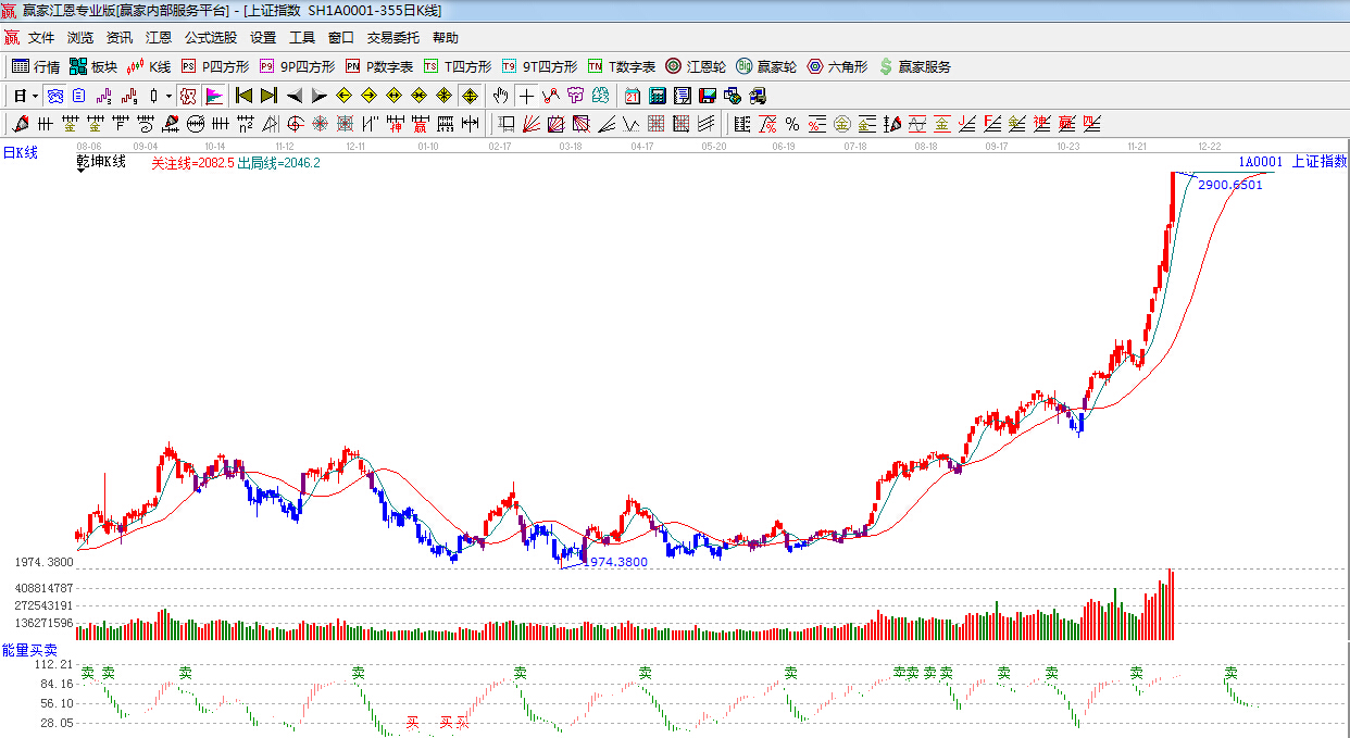 ☆依據贏家江恩系統能量買賣提示:紅色看多能量柱,短線看多,但較前期紅色柱子,有背離,謹慎看多。