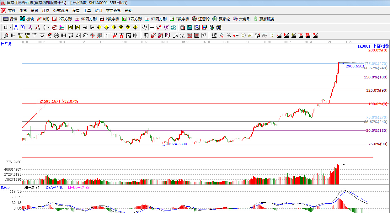 江恩看盤綜述:依據贏家江恩技術工具分析得出:滬深兩市繼續保持逼空式上漲,放量突破江恩三分位240度線,此 位置轉換為支撐,回踩不破將會繼續向上拓展空間,上方0度位置3034點,目前只要券商不倒,大盤就能繼續上漲,操作 上,后市繼續關注反彈中漲幅落后的低估藍籌。