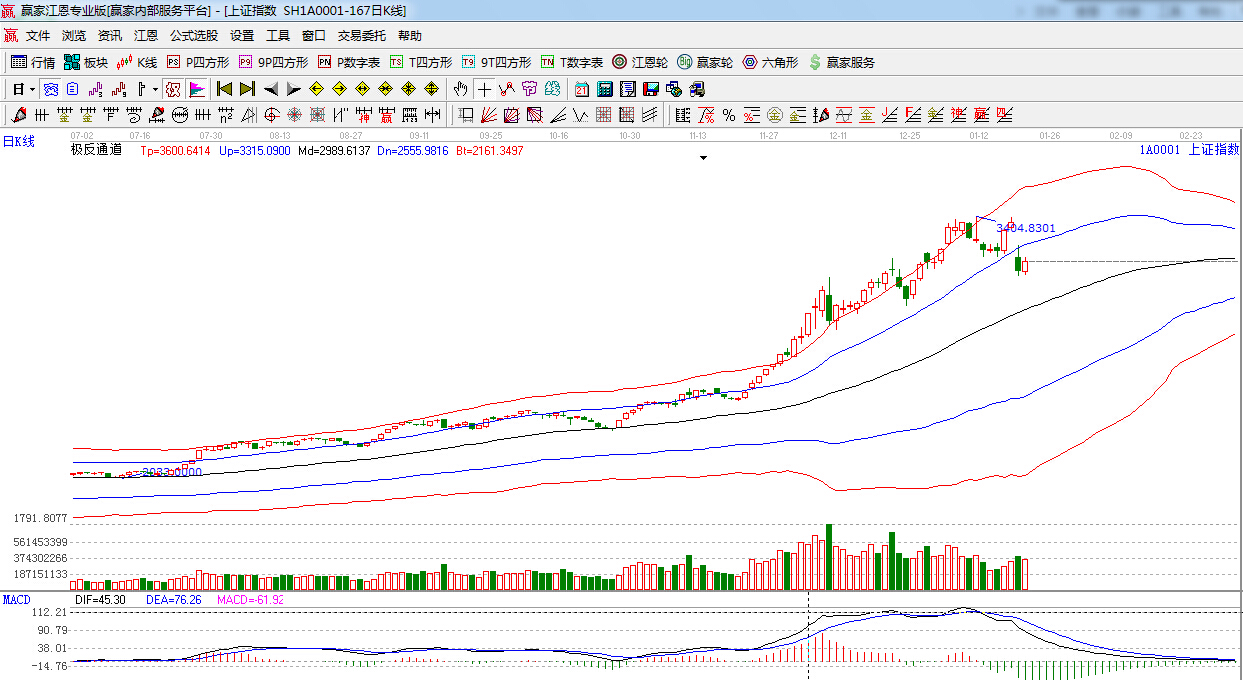 極反通道提示:滬指低開震蕩反彈,短線阻力位藍(lán)色外軌線,外軌線3270點。