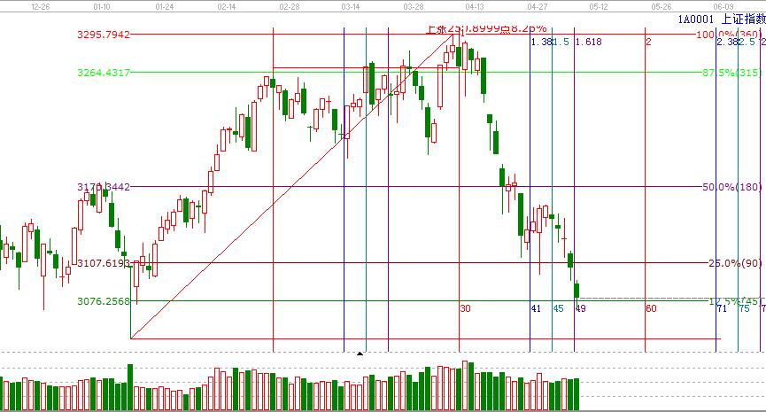 依據贏家江恩技術工具分析得出:周一,滬指低開低走,直奔3075點,小幅反彈后再次回落,最低試探極反通道藍色下軌線3067點后回升,收盤在3078點,極反通道,物極必反,目前藍色下軌線附近,超跌反彈隨時可能發生,百分比價格上3075點的得失也非常重要,重點觀察5月9日的量價表現,操作上,做好分批低吸的準備,機會上,可重點關注質地優良、業績增長明顯的創業板超跌股。