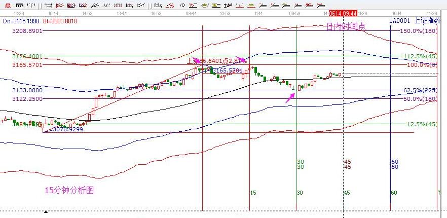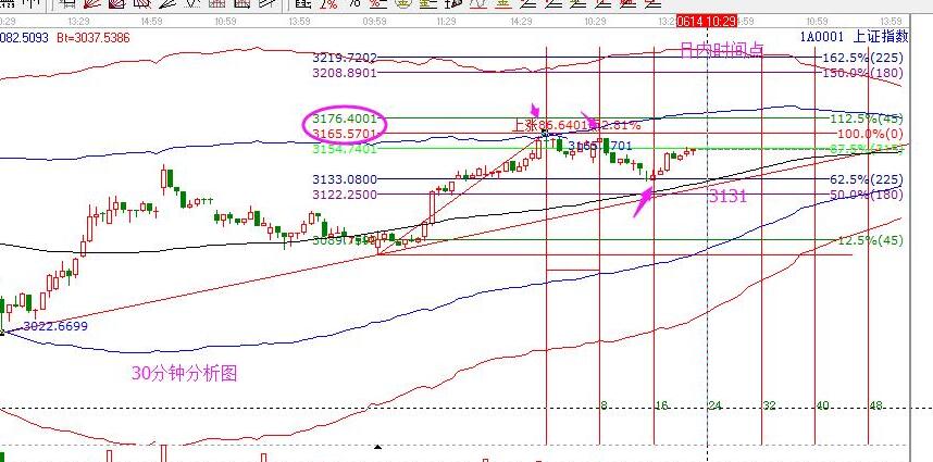 昨日分析及走勢:昨日早盤分析中,給出的支撐是3120,壓力是3155點,日內(nèi)時間10點。實際走勢為:最高3155點,一點不差,日內(nèi)時間10點在3131止跌起漲,沒有完全回踩到預(yù)期的支撐,但時間為先,對照下方15分鐘圖和30分鐘圖,可以清晰的看到昨天市場的運行軌跡。以前分享過這個經(jīng)驗,再說明一次:以兩個高點做等距周期,按照經(jīng)驗對應(yīng)的下個時間見低點概率大,昨天的走勢再次驗證了此成功率。15分鐘和30分鐘小雙頭預(yù)測了昨天的低點時間,大盤個股都通用,有心的朋友可以結(jié)合自己的股票試試奧。大盤生命線附近震蕩鞏固,僅作短線回調(diào)對待,3016和3022雙針引發(fā)的上漲遠未結(jié)束,所以按照自己的策略執(zhí)行交易即可。