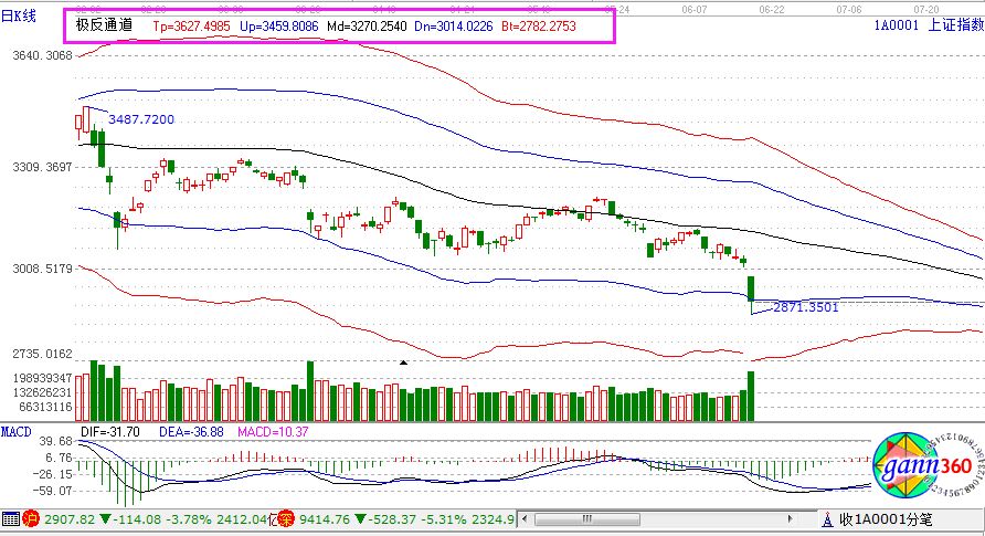 滬指跌3.78%,報收2907點;深成指跌5.31%,報收9414點;創業板跌5.76%,報收1547點。盤面上看,鈦白粉、通信技術、造紙、特鋼、自由貿易港、知識產權保護、CDR概念等板塊跌幅居前。全天,滬股通凈流出19億元,深股通凈流出900萬元。相應的極反通道指標的支撐壓力提示,如下圖所示: