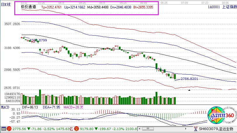滬指跌2.52%,報收2775點;深成指跌2.13%,報收9179點;創業板跌1.14%,報收1588點。從盤面上看,海南、食品安全、分散染料等少數板塊飄紅;粵港澳大灣區、煤炭、鋼鐵、租售同權、證券、銀行、房地產等板塊跌幅居前。相應的極反通道指標的支撐壓力提示,如下圖所示: