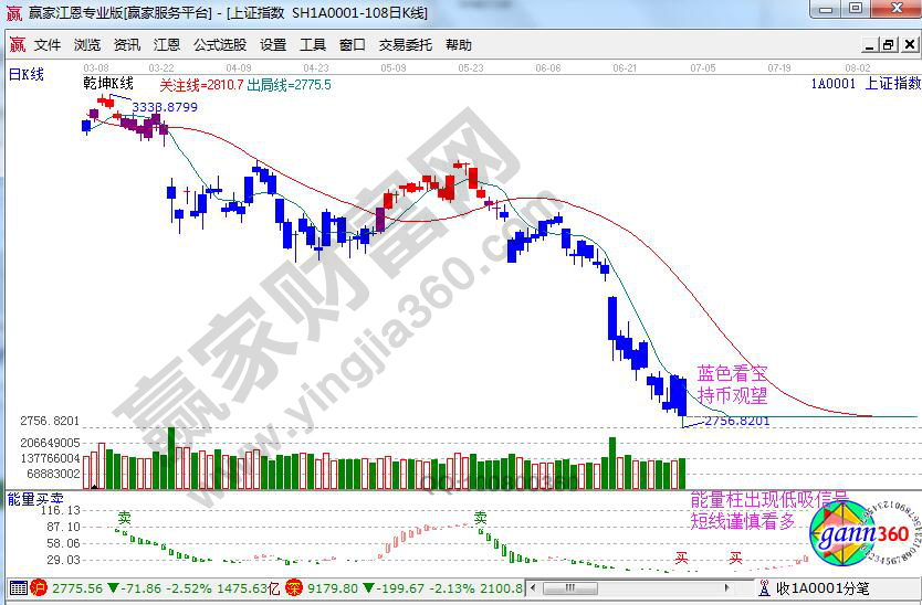 江恩看盤綜述:通過江恩理論系統趨勢、時間、價格工具綜合評判市場一星看多(五星評級標準)。今日市場反抽日線極反通道藍線受阻后,再次快速殺跌,跌穿2800點,空間上看有繼續下尋2700一線的需求,操作上嚴控倉位保持謹慎;短線先關注日內30分鐘通道藍線2750一線的支撐,短線壓力2810-2840。